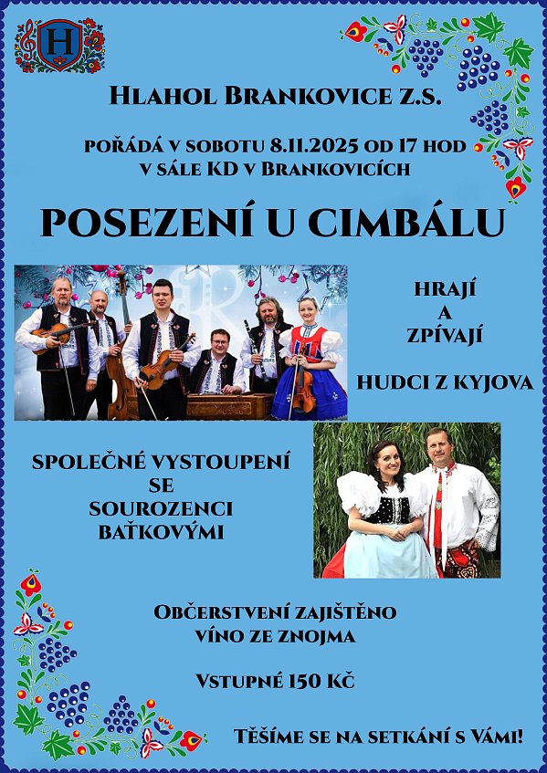 Mužský pěvecký sbor Hlahol Brankovice Vás zve na posezení u cimbálu. Akce se uskuteční v sobotu 8.11.2025 v kulturním domě v Brankovicích od 17 hod. Zahraje a zazpívá cimbálová muzika Hudci z Kyjova společně se sourozenci Baťkovými. Občerstvení pro návštěvníky je zajištěno. Na setkání s Vámi se těší chlapi z Hlaholu | |